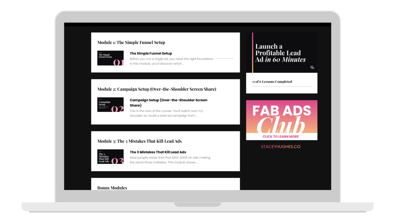 A step-by-step, mini course that walks you through building, launching, and optimising your very first Facebook & Instagram lead ad — in a single 60-minute session. No tech headaches. No guesswork. Just leads.